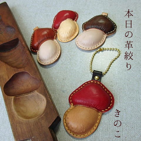 今日は、こんな和菓子の木型を使って作ったレザーきのこを
