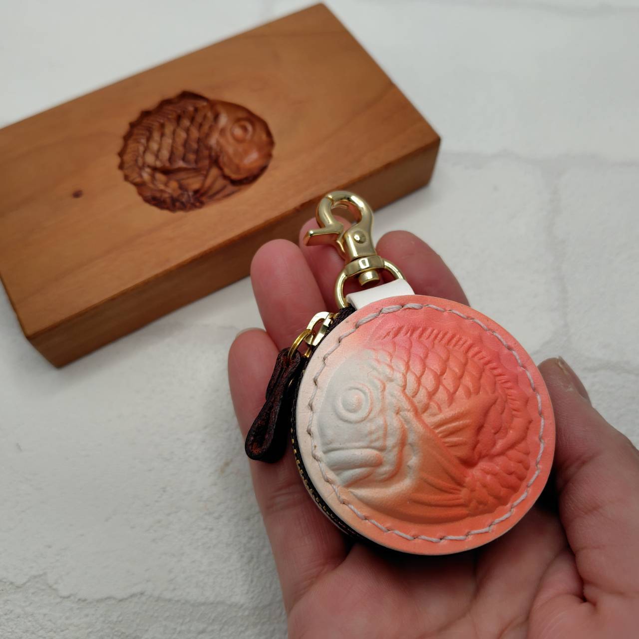 鯛の部分はヌメ革を濡らして