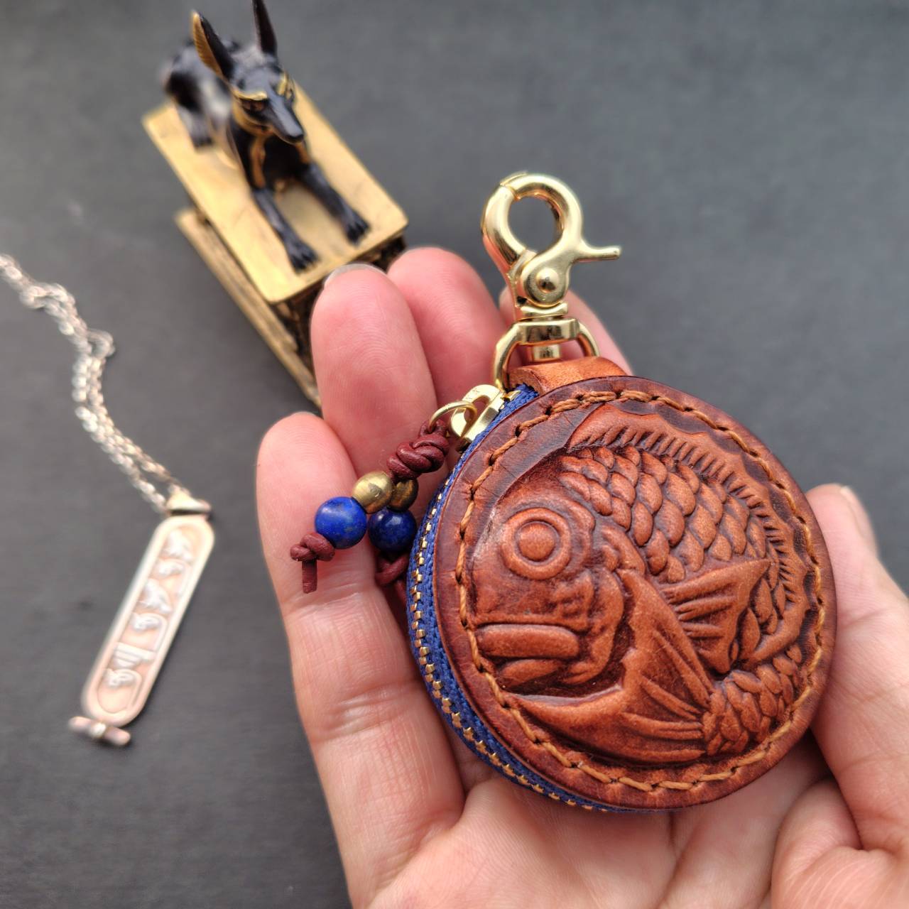 鯛の部分はヌメ革を濡らして