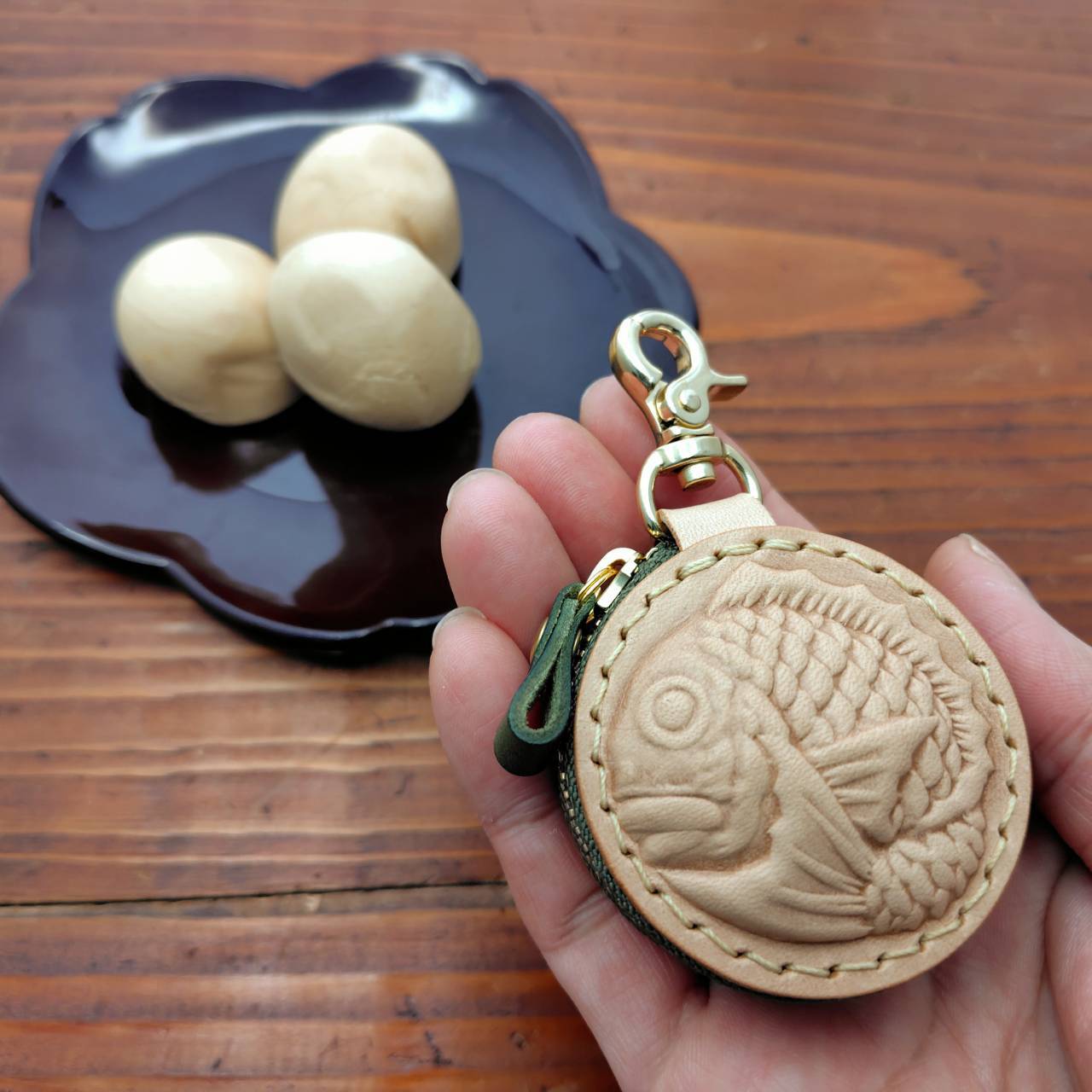 鯛の部分はヌメ革を濡らして