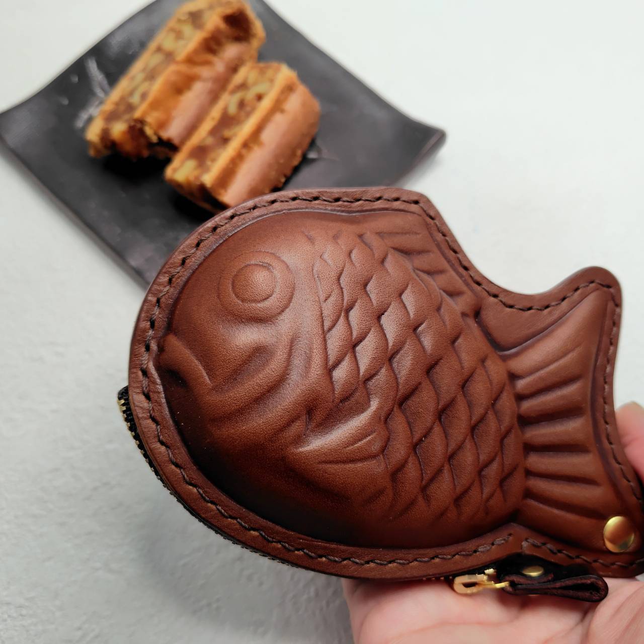 ヌメ革を濡らして本物のたい焼き器を使い圧力をかけて